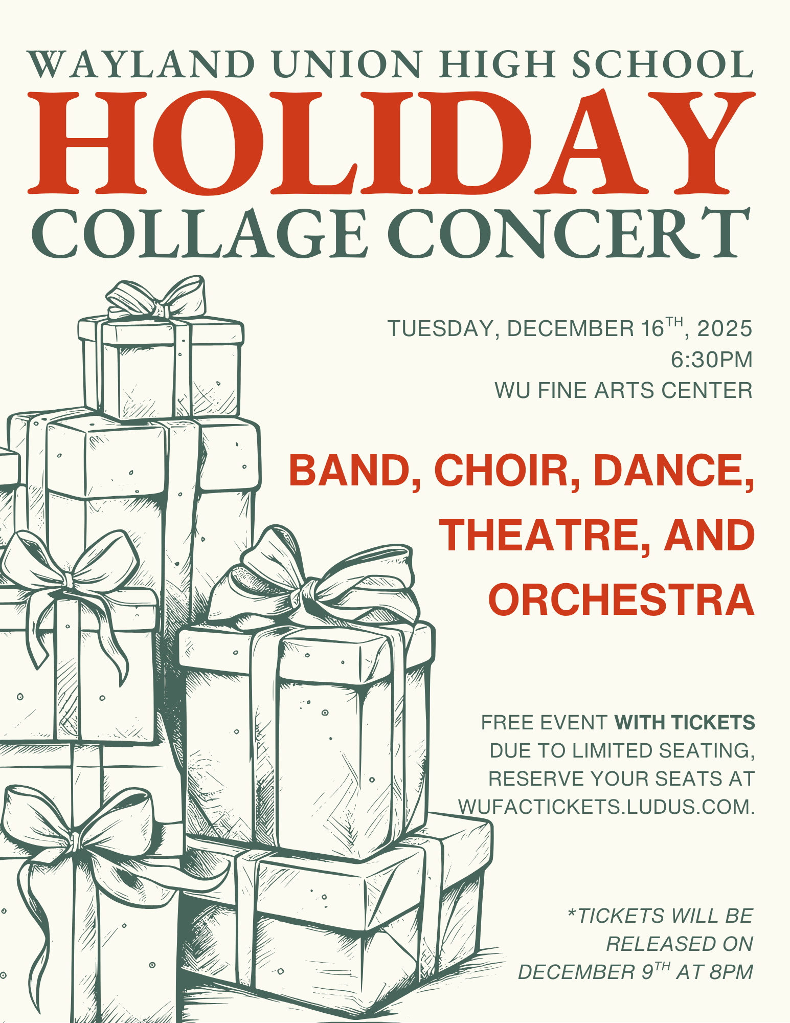 Our high school is bringing back their Holiday Collage Concert on Tuesday, December 16th at 6:30pm in the Wayland Union Fine Arts Center.