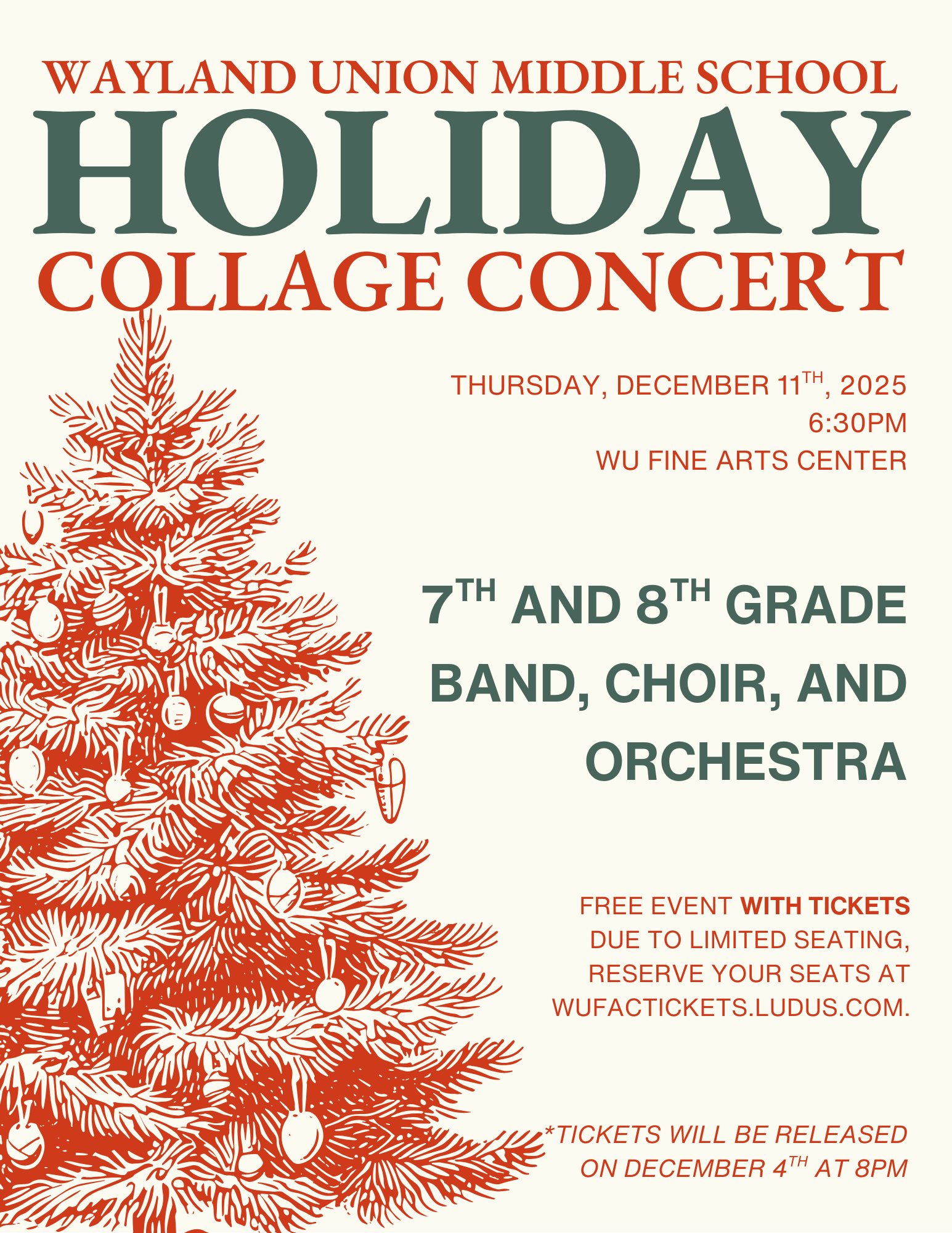 Our high school is bringing back their Holiday Collage Concert on Tuesday, December 16th at 6:30pm in the Wayland Union Fine Arts Center.